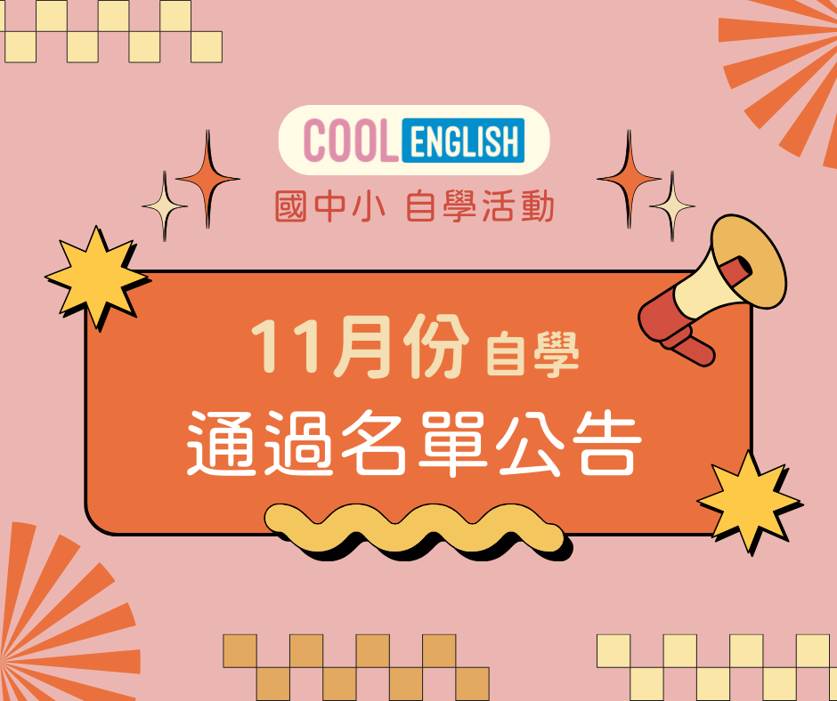 【114年國中小自學活動】11月份通過名單出爐🔥 2025年 12月 2日(Tue) 14:30 Number of replies: 0 🏆 11月份通過名單:https://lihi.cc/4R38b 本活動不提供複查服務。 如有以下任一情形者,不列入本次通過名單。 1. 未於11/30前填寫報名表 2. 未使用同一支帳號報名&進行自學 or 跨組報名 3. 報名資料填寫不齊,致團隊無法辨識其身分 4. 學習時間內的停留平台時間未達所屬組別(一般/偏遠)標準 Cool English團隊感謝您的支持! 回列表