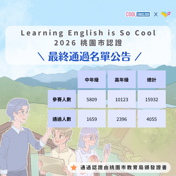 📢 2026 Learning English is So Cool_桃園市最終通過名單 2026年 03月 24日(週二) 15:49 Number of replies: 0 【 Learning English is So Cool 桃園市認證 最終通過名單揭曉】點我看最終通過名單 https://reurl.cc/Dxy9GO感謝全體桃園市的同學與師長的支持 也恭喜所有通過認證的同學 本次活動成績複查期已結束,恕不接受成績複查與資料補齊。如有敘獎相關問題,請洽桃園市文欣國小教務處 03-3974893 #214 或 #210 回列表