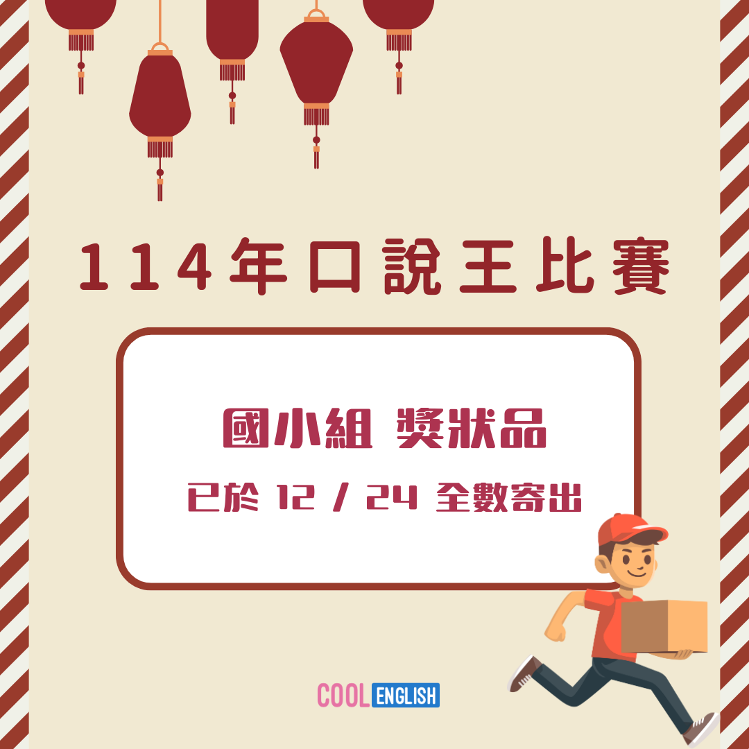 [公告] 【114年國中小口說王比賽】📢國小獎狀品已於12/24寄出 2025年 12月 26日(Fri) 09:26 Number of replies: 0 【酷英 114 年口說王比賽】獎狀品寄送通知 【國小組獎狀品】已於 12/24 全部寄出囉! 想查包裹點此:https://lihi.cc/wbI5P平安夜,酷編悄悄地扮成聖誕老公公把大家期待已久的口說王獎狀品都寄出囉感謝大家熱情的參與~我們明年見!預祝 大家 聖誕節快樂 HO HO HO 小提醒請各校師長協助留意:貴校若有「禮券」得主,才會有「簽收回條」在回條上就找的到回傳的QRcode囉! 回列表